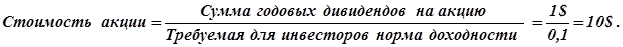 Данный факт можно продемонстрировать на примере. Предположим, что требуемая норма доходности для инвесторов составляет 10% годовых. Фирма на протяжении нескольких лет осуществляла выплаты дивидендов из расчета 1$ на акцию номиналом 10$. В этой связи рынок оценивал фундаментальную стоимость акций данной фирмы в 10$, которая определяется как (формула Гордона):