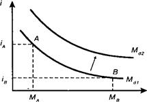 Кривая спроса на деньги имеет отрицательный угол наклона, так как по мере уменьшения ставки процента спрос на деньги возрастает (при определенном уровне номинального национального дохода). При снижении ставки процента происходит скольжение вдоль кривой спроса на деньги Md1 из точки А в точку В. С увеличением уровня номинального национального дохода происходит сдвиг кривой спроса на деньги из положения Md1 в положение Md2.