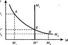 Равновесие находится в точке пересечения кривых спроса и предложения денег — Е. В данной точке получены равновесные значения М* (на оси абсцисс) и i* (на оси ординат), выражающие соответствие количества денег, которое экономические субъекты хотят иметь, количеству денег, предоставляемому банковской системой при равновесной ставке процента. Таким образом, при заданном предложении денег, равном M*, равновесие достигается при значении процента, равном i*.