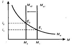 Предположим, что денежный рынок находится в состоянии равновесия в точке Е1. Если количество денег в обращении уменьшится, то кривая предложения денег переместится из положения Ms1, в положение Ms2.