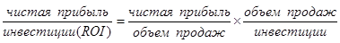 Прибыль на инвестированный капитал (ROI) равна чистой прибыли, деленной на инвестиции. Коэффициент ROI можно рассматривать как совокупный результат двух факторов: рентабельности продаж и использования инвестиций: