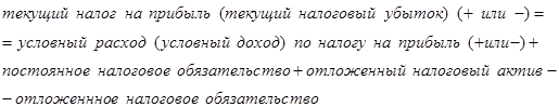 Чистая прибыль (убыток) отчетного года представляет собой бухгалтерскую прибыль (прибыль до налогообложения), скорректированную на суммы отложенных налоговых активов, отложенных налоговых обязательств и текущего налога на прибыль. Согласно ПБУ 18/02 сумму текущего налога на прибыль (текущего налогового убытка) определяют по формуле[17]: