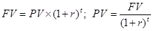 где FV — будущая стоимость денежных потоков от объекта инвестирования; PV — настоящая стоимость денежных потоков от объекта инвестирования; r — ставка дисконтирования, доли единицы; t — расчетный период, лет.