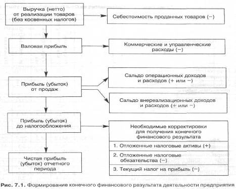 Следует иметь в виду, что при получении финансирования на покрытие расходов прошлых лет причитающиеся к получению бюджетные средства непосредственно относят к внереализационным доходам. Формирование конечного финансового результата предприятия в форме чистой прибыли (убытка) отчетного периода показано на рис. 7.1.