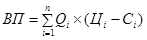 где Qi — объем производства продукции i-го вида в натуральном выражении (тонн, штук, м2 и т. д.); Ц1 — продажная цена продукции г-го вида, руб.; Ci — себестоимость единицы продукции i-го вида, руб.; i — конкретный вид реализуемой продукции; п — количество видов реализуемой продукции (г = 1, 2, 3, ., п).