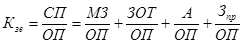 где Кзе— коэффициент затратоемкости продукции, доли единицы; СП— себестоимость произведенной продукции, тыс. руб.; ОП — объем производства продукции, тыс. руб.; МЗ — материальные затраты, тыс. руб.; ЗОТ — затраты на оплату труда, тыс. руб.; А — амортизация основного капитала, тыс. руб.; Зрп — прочие затраты, тыс. руб.