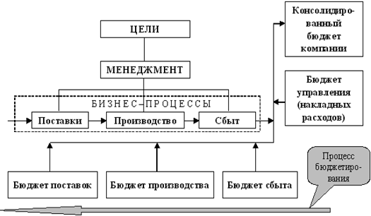 При определении последовательности составления бюджетов необходимо принимать во внимание бизнес-процессы, формализованные и описанные на этапе анализа внешней и внутренней среды. Общий вид проекции бизнес-процессов на бюджет представлен на рисунке 7. Принципиальным положением является то, что процесс бюджетирования происходит в направлении, противоположном реальному течению основных бизнес-процессов. Если текущий бизнес начинается с поставок и заканчивается продажами, то бюджетирование следует начинать с продаж, затем переходить на производство и заканчивать поставками. Разумеется, наряду с этим необходимо составить бюджеты всех центров затрат и консолидировать итоговые данные всех бюджетов в единую систему финансовых бюджетов: прогнозный баланс, прогнозный отчет о прибыли и прогнозный отчет о движении денежных средств.