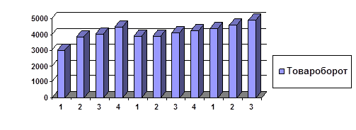 Увеличившись к концу 4 квартала 2004г. до 4454 тыс.руб, товарооборот в 1 квартале 2005 года снизился до 3897 тыс.руб, достигнув лишь к 1 кварталу 2006 года суммы в 4380 тыс.руб. В целом товарооборот за исследуемый период увеличился на 1900 тыс.руб, или на 63%