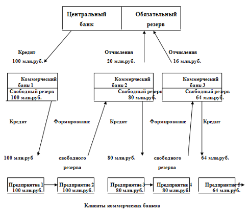Коммерческий банк 3 часть полученного резерва в размере 16 млн. руб. (20% от 80 млн. руб.) отчисляет в централизованный резерв, а оставшуюся часть – 64 млн. руб. банк 3 использует для выдачи кредита следующему предприятию.