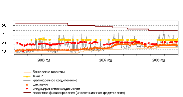 Процентная ставка по лизингу и синдицированному кредитованию находятся примерно на одном уровне, и на протяжении всего анализируемого периода не претерпели существенных изменений. Их значение в период с 2006 по 2008 оставалось на уровне 20-22 % годовых (см. рис. 2.5).