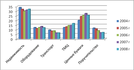 Так же относительной популярностью пользуются такие виды обеспечения как оборудование, транспорт, поручительство. Однако они занимают от 12 до 15 % доли в структуре всех видов обеспечения, так как практически все предприятия экспортно-ориентированных отраслей имеют высоколиквидные ценные бумаги, и ликвидные объекты коммерческой недвижимости.