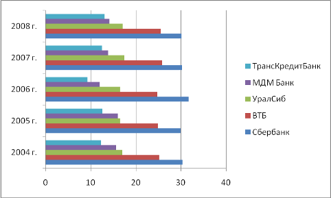 Как показано на рис. 2.7, наибольшая доля в структуре кредитного портфеля отраслей, ориентированных на внутреннее потребление, принадлежит Сбербанку. Его доля на протяжении всего анализируемого периода находилась на уровне 30%. Однако в 2006 году, она увеличилась на 2,3%, и в 2007 году вновь приняла исходное значение. Стабильное значение так же имеет доля ВТБ. На протяжении всего анализируемого периода ее значение составляло 25 – 25,5%. Третье место в структуре основных кредиторов отраслей, ориентированных на внутренний рынок принадлежит УралСибу. Тенденцию развития доли данного банка можно так же охарактеризовать как стабильную, без существенных изменений, находящейся на уровне 18,2-19%. МДМ Банк в 2004 году имел долю в 17,2%, которая в 2005 году осталась на прежнем уровне, а в 2006 году резко снизилась – на 20,1%. В 2007 году МДМ Банк частично вернул свои позиции на данном сегменте рынка, и рост объемов кредитования отраслей, ориентированных на внутреннее потребление составил 18,9%, и оставался на таком уровне на протяжении всего 2008 года. Тенденция деятельности ТрансКредитБанка повторяет ситуацию МДМ Банка. Доля на данном сегменте рынка данного банка оставалась стабильной до 2006 года, в котором произошел резкий спад – на 22,8%. Однако банк предпринял максим усилий для того, чтобы удержать свои позиции на данном сегменте рынка корпоративного кредитования. Ему это удалось – удержать об этом свидетельствует рост, который можно наблюдать в 2007 на 24%, который удержался на таком же уровне и в 2008 году.