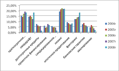 Как видно из рис.2.9, наибольший удельный вес в структуре видов кредитования занимает лизинг. Причем, начиная с 2004 года наблюдается рост позиций этого вида кредитования в данном секторе. Так, в 2005 году рост соответствует уровню 19,5% прошлого года, в 2006 году – популярность лизинга выросла еще на 12,6%. Однако, 2007 год принес спад популярности этого вида кредитования – на 12,2%, и этот уровень сохранился на протяжении всего 208 года. Мощным стимулом для развития данного вида кредитования, стало внесение изменений в закон "О финансовой аренде (лизинге)" - был существенно либерализован целый ряд его положений, убраны лишние ограничения по содержанию и форме договора, а также ненужные с практической точки зрения определения и понятия (например, определения различных видов лизинга, помимо финансовой аренды как таковой) [44, с. 22]. Однако с развитием и других форм кредитования (например, краткосрочного кредитования, занявшего второе место в данной структуре) лизинг почувствовал на себе сильную конкуренцию, и в 2007 году ослабил свои позиции и отдал 12,2% доли в структуре кредитования отраслей, ориентированных на внутренний рынок краткосрочному кредитованию, которое начиная с 2005 года увеличивало свою популярность на 10-12% каждый год, и лишь в 208 году объемы, выдаваемые в форме краткосрочных кредитов сократились на 9,8%. Овердрафт и факторинг разделили меж собой третье место в данной структуре. Причем эти два вида кредитования имеют абсолютно разную тенденцию: факторинг, начиная с 2004 года увеличивает свою популярность среди компаний, ориентированных на внутреннее потребление с каждым годом примерно на 12-15%, а 2008 год приносит примерно 20,9% доли в структуре видов кредитования. А вот, овердрафт напротив, имеет отрицательную тенденцию: в 2005 году наблюдается небольшой рост – в11,1%, и начиная с 2005 года – спад. В 2006 году рост составил 14%, в 2007 году – 15,6% по отношению к предыдущему году. Лишь только 2008 год приносит резкое увеличение объемов кредитования в данной форме – на 24% (см. рис.2.9).