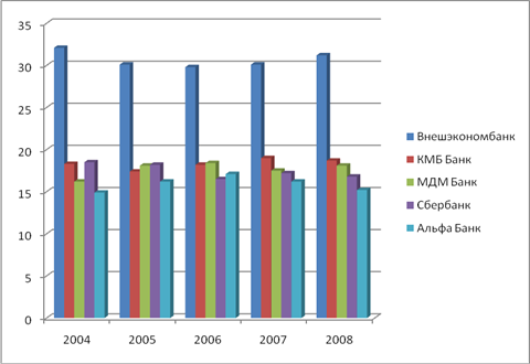 Внешэкономбанк так же как и по России в целом, в нашем регионе имеет наибольший удельный вес и занимает треть доли ранка на данном сегменте, причем сохраняет свои позиции на протяжении всего анализируемого периода. Этот банк лишь в незначительной доли снижает свои позиции: в среднем за анализируемый период на 12-15%. Второе место в данной структуре делят меж собой МДМ И КМБ банки. Причем КМБ банк в 2004 году имел долю ранка, превышающую МДМ на 15%, а в последующие года потерял свои позиции и уступил МДМ банку, но в 2007 году вновь увеличил свой кредитный портфель на 12,5% и удержал эту тенденцию до следующего года.