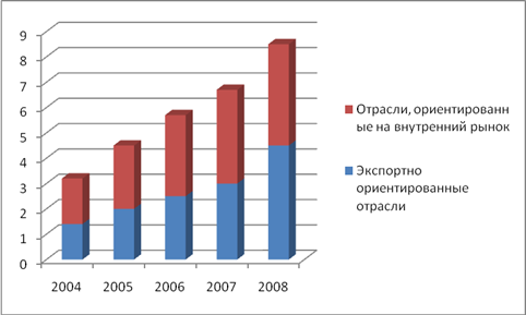 Кредитование реального сектора экономики неуклонно растет на протяжении всего анализируемого периода. Так, отрасли, ориентированные на внутренний рынок в 2005 году потребили кредитных ресурсов в 1,2 раза больше, чем в 2004 году. Рост продолжался и в 2006 году – он составил 30% по отношению к 2005году. В 2007 году рост замедлился и составил 21% по сравнению с предыдущим годом. Однако и в 2008 рост объемов кредитования отраслей, ориентированных на внутренний рынок по сравнению с 2007 годом составил всего 12% (см. рис. 2.1).