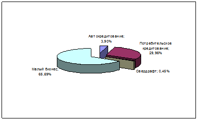 Рассмотрим структуру совокупного кредитного портфеля, которая приведена на нижеследующем рисунке 6 из которого видно, что кредитный портфель банка состоит из кредитов на развитие малого бизнеса, потребительских кредитов, кредитов на покупку автомобиля, а также кредитов предоставленных в форме овердрафта по пластиковым картам.