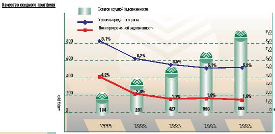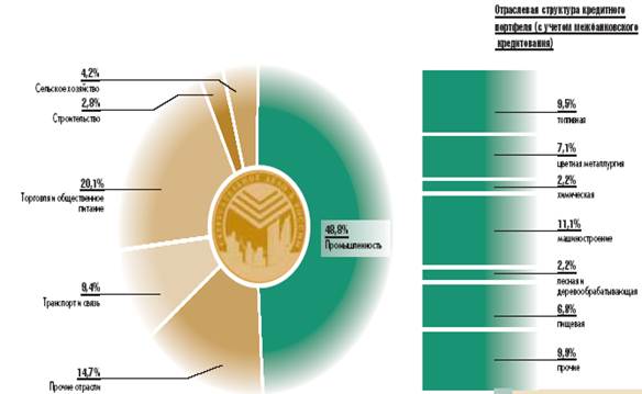 Сохранилась тенденция увеличения объемов предоставляемых средств юридическим лицам на срок свыше года. В 2003 году Банк существенно увеличил объемы вложений в реальный сектор экономики с 495,0 млрд. рублей до 710,1 млрд. рублей, что составляет 82,3% от общего остатка ссудной задолженности. Увеличение потребностей данного сегмента в кредитных ресурсах позволило Банку расширить объемы операций и укрепить сотрудничество с крупными предприятиями, федерально-значимыми структурами, экспортерами и импортерами, а также предприятиями наиболее инвестиционно привлекательных отраслей промышленности.