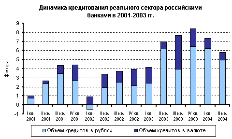 Объем кредитов, предоставленных российским банковским сектором нефинансовым предприятиям и организациям в рублях и иностранной валюте на 1 июля 2004г. составил[15] – 2,65 трлн. руб. ($86,4 млрд.), что на 39,6% больше в долларовом выражении, чем в аналогичном периоде 2003г. В течение I полугодия 2004г. в реальный сектор экономики было направлено 350,2 млрд. руб. ($11,4 млрд.) кредитных ресурсов. Итого, объем предоставленных кредитов за I полугодие прошлого года вырос в долларовом выражении на 15,3% по отношению к началу года. В I полугодии 2003г. объем кредитования реального сектора экономики составил 266,1 млрд. руб. ($11,2 млрд.), рост составил 22% (см. Рисунок 1).