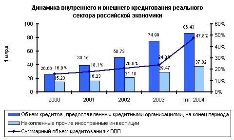 В целом наблюдались позитивные изменения в вопросе привлечения российскими предприятиями кредитных ресурсов. Но в связи с «кризисом доверия», произошедшим прошлым летом и кризисом ликвидности наблюдался рост ставок кредитования. Так, к августу 2004г. ставки выросли до уровня конца 2003г., а в ряде банков превысили этот уровень. Что касается сроков, то в целом в годовом измерении наблюдалось постепенное увеличение доли долгосрочных кредитных ресурсов, однако, из-за «кризиса доверия» с мая 2004г. наблюдалось уменьшение сроков кредитования.[17]