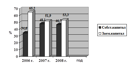 В период с 2006 по 2007 год наблюдается тенденция увеличения доли собственных средств в структуре капитала (на 13,5%). Доля заемного капитала снизилась с 65,2% до 51,9%, причем темп прироста собственного капитала опережает темп прироста заемного.