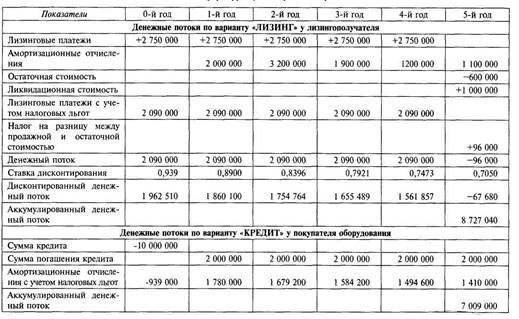 Компания предполагает, что после пятого года сможет реализовать выкупленное по договору лизинга оборудование за 1 млн. у.е. Ежегодные лизинговые платежи в течение 5 лет (оплата производится в начале года) 2 750 000 у. е. в начале каждого года. Договором лизинга предусмотрено, что обслуживать оборудование будет лизингодатель без дополнительной платы. Ставка налога на прибыль - 40%.