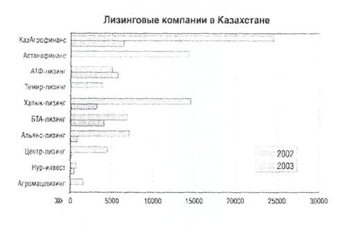 Ведущими лизинговыми компаниями (в т.ч. банки, занимающиеся лизингом) по результатам работы за 9 мес. 2004 года (без учета ЗАО «Казагрофинанс») по объему переданных в лизинг основных средств являются (по убыванию) Астана Финанс, БТА Лизинг, Халык Лизинг, Центр Лизинг, Вираж Лизинг. По результатам работы за 2003 год ситуация выглядела следующим образом: Астана финанс, Валют Транзит Банк, Халык Лизинг, Альянс Лизинг, БТА Лизинг.
