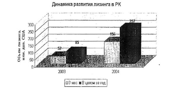 В международной практике лизинг никогда не был более дешевым, чем кредит, инструментом финансирования. Более доступным - да, но его доступность заключается в лояльном, менее формализованном отношении лизингодателя к заемщику в отличие от банка и, самое главное, в ненужности залога, даже предприятию, располагающему активами, подходящими банку в качестве залога, для покупки основных средств лучше пользоваться лизингом, а с'помощью кредитов пополнять свои оборотные средства. Имея незаложенные активы, предприятие более мобильно при привлечении краткосрочного финансирования. Лизинг динамично развивается. В 2003 году объемы лизинга выросли в 4 раза по сравнению с 2002 г. и составили порядка 85 млн. долларов США. За 9 месяцев 2004 данный показатель увеличился в три раза по сравнению с аналогичным периодом 2003г и составил порядка 156 млн. долларов США.