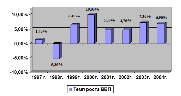 За время, прошедшее после кризиса 1998 г., экономика России развивалась довольно быстрыми темпами. Темпы роста ВВП постепенно росли и в 2000г. составили 10,0%. Эта тенденция изменилась в 2001 г.: рост ВВП в составил 5,0% по сравнению с прошлым годом, а в 2002 г. 4,7%. В 2003 г. наметился рост ВВП и составил 7,3% За текущий год рост ВВП отстает от предыдущего года и составляет 6,9%, что на 0,4% ниже прошлогоднего. Темпы роста ВВП представлены в Диаграмме 1.