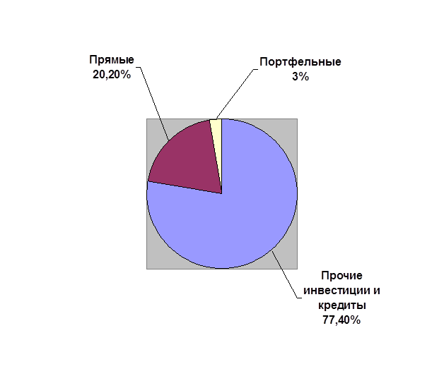 По структуре большую часть иностранных инвестиций составляют прочие инвестиции (кредиты). Отмечается незначительное падение доли портфельных инвестиций по сравнению с 2003 годом, однако у этого вида инвестиций все же есть большой потенциал для роста. Структура представлена в Диаграмме№2.