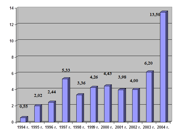 Объем иностранных инвестиций, поступивших в Россию в 2004г., увеличился по сравнению с 2003 г. на 46,9% и составил 13,5 млрд. долларов США.