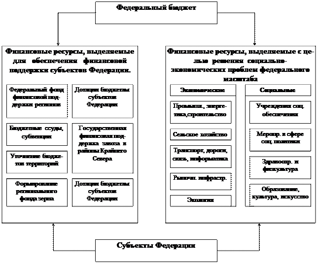 Вертикальное выравнивание непременно должно сочетаться с горизонтальным, означающим пропорциональное распределение налогов и дотаций между субъектами Федерации для устранения неравенства в возможностях различных территорий, вызванных территориальным фактором. Таким образом, получается, что к расходам федерального бюджета на решение социально-экономических задач федерального масштаба добавляются еще и расходы на достижение сбалансированности бюджетной системы (см. Рис. 1.1)