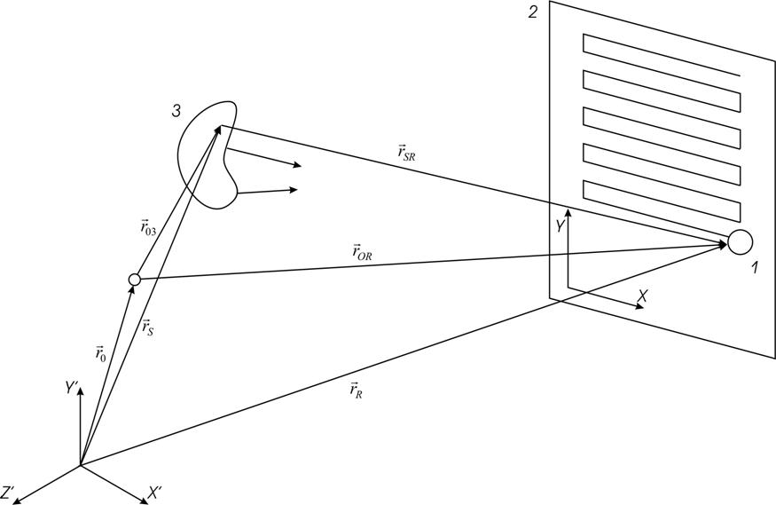 Пусть акустическая голограмма регистрируется путем постоянного сканирования точечным линейным приемником 1 в некоторой плоскости 2 (рис.3), тогда выходное напряжение на приемнике