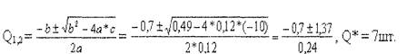 2. Прибыль будет максимальной при условии, что ТR' =ТС' => 16 - Q = 6 - 0,3*Q +0,12Q2 = 0, 0,12Q2 + 0,7 Q - 10 = 0 =>