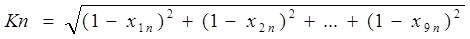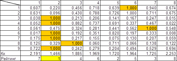Исходные показатели предыдущей матрицы стандартизуются в отношении соответветствующего показателя эталонного предприятия по формуле: