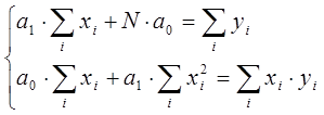 Для нахождения коэффициентов парной линейной регрессии вида y=a1·x + a0 методом наименьших квадратов необходимо решить систему:
