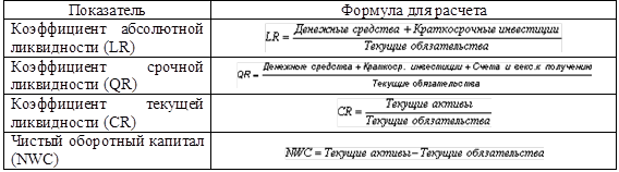 Представим формулы для расчета коэффициентов ликвидности (таблица 4).