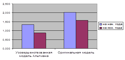 Проведя оценку кредитоспособности по усовершенствованной модели Альтмена можно сказать, что предприятие за отчетный финансовый год улучшило свое состояние. В начале отчетного года угроза банкротства предприятия оценивалась как высокая при Z = 0,868, а в конце года предприятие в 3 раза увеличило выручку (на 308%, что составило 41099 тыс.руб.) и операционную на 1823% (75 тыс.руб.), что увеличило индекс кредитоспособности Альтмена и он вырос до 1,572. Это означает, что предприятие снизило зону с высокой угрозы банкротства до зоны неведения.