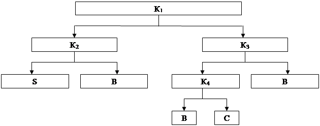 При классификации кредитов возможно использование модели CART (Classification and regression trees), что переводится как «классификационные и регрессионные деревья». Это непараметрическая модель, основные достоинства которой заключаются в возможности широкого применения, доступности для понимания и легкости вычислений, хотя при построении применяются сложные статистические методы. В «классификационном дереве» фирмы-заемщики расположены на определенной «ветви» в зависимости от значений выбранных финансовых коэффициентов; далее идет «разветвление» каждой из них в зависимости от следующих коэффициентов. Точность классификации при использовании данной модели – около 90%. Пример «классификационного дерева» представлен на рис. 2, где Кi — финансовый коэффициент; Рi — нормативное значение показателя; В — предполагаемый банкрот; S — предположительно устойчивое состояние.