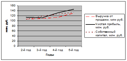 По данному графику можно сделать следующие выводы: собственный капитал имеет тенденцию роста, только в 3-м году наблюдается стабильность, вследствие чего наблюдается тенденция роста выручки от продажи и чистой прибыли, особенно в 5 –м году.