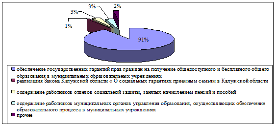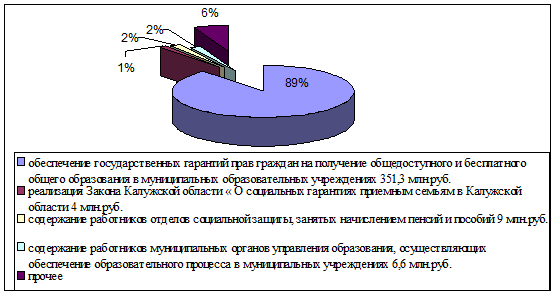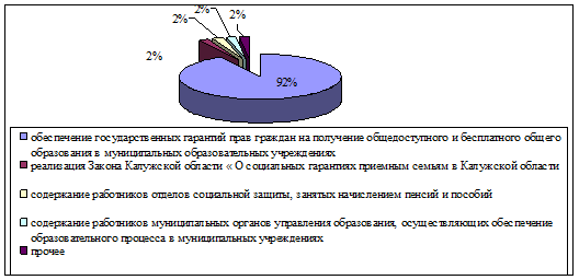 Данный рисунок отражает, что большая часть средств приходиться на обеспечение гарантий прав на получение общедоступного и бесплатного образования в муниципальных образовательных учреждениях (89%), но произошло снижение по сравнению с предыдущим годом на 2%. Как и в 2004 году на реализацию Закона Калужской области «О социальных гарантиях приемным семьям в Калужской области приходиться 1%, 2% на содержание работников отделов социальной защиты, занятых начислением пенсий и пособий и 2% на содержание работников муниципальных органов управления образования, осуществляющих обеспечение образовательного процесса в муниципальных учреждениях.