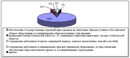 На 2008 год запланирован следующий объем средств на реализацию государственных полномочий: обеспечение гарантий прав на получение общедоступного и бесплатного образования в муниципальных образовательных учреждениях 93% от общего объема средств (намечен рост на 1%), 2% на реализацию Закона Калужской области «О социальных гарантиях приемным семьям в Калужской области», 3% на содержание работников муниципальных органов управления образования, осуществляющих обеспечение образовательного процесса в муниципальных учреждениях (+1% к 2007 году) и лишь 1% на содержание работников отделов социальной защиты, занятых начислением пенсий и пособий. (рис. 12).