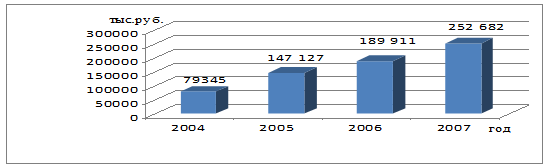 На рисунке заметна тенденция увеличения, в 2004 году расходы по данной статье составили 79345 тыс. руб., в 2005 году – 147127 тыс. руб., что на 67782 тыс. руб. больше, чем в предыдущем году, в 2006 году они равны 189911 тыс. руб., произошло увеличение на 42784 тыс. руб., в 2007 году определены в объеме 252682 тыс. руб. – увеличение на 62771 тыс. руб. (33,05% по отношению к 2006 году.) и на 10555 тыс. руб. (71,74%) по отношению к 2005 году.