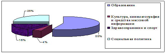 На финансирование отраслей социально-культурной сферы в бюджете муниципального образования «Город Калуга» на 2008 год предусмотрены расходы в сумме 2 943 513 тыс. рублей, что составляет 65,1% от суммы всех расходов. При этом наибольший удельный вес по-прежнему приходится на финансирование образования (1 609 320 тыс. руб. или 54,7% в общей сумме расходов на социально – культурную сферу). На здравоохранение и спорт в 2008 году предусмотрено 460 906 тыс. руб. или 15,7%, на социальную политику – 751 506 тыс. руб. или 25,5% от суммы расходов на социально-культурную сферу. Отметим, что за последние 4 года более, чем в 5 раз возросли расходы на культуру. В 2008 году запланировано 121781 тыс. руб. (4,1%) (Рис. 5.)