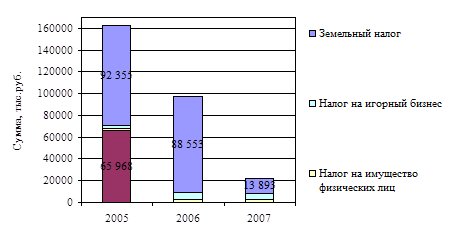 Значительное поступление в 2006 году налога на имущество физических лиц, скорее всего, было вызвано желанием местных органов власти таким образом частично компенсировать выпавшие суммы доходов по налогу на прибыль – ведь с 2005 года налога на прибыль перестали зачислять в местные бюджеты. Частичное снижение поступлений по налогу в 2007 году на 3 % произошло из-за применения режима исключений из объектов и льгот.