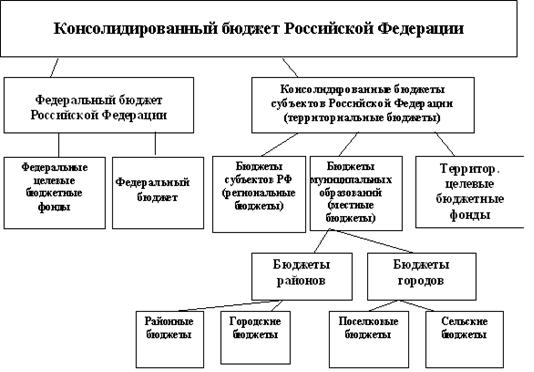 Консолидированный бюджет Российской Федерации включает федеральный бюджет и консолидированные бюджеты субъектов Российской Федерации. В свою очередь, консолидированный бюджет субъекта Российской Федерации включает региональный бюджет, т.е. бюджет субъекта Российской Федерации и местные бюджеты. [20]