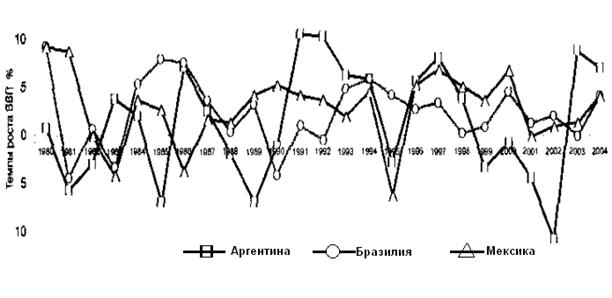 Многие отечественные экономисты указывают на прямые иностранные инвестиции (ПИИ) как один из важнейших источников модернизации российской экономики. Между тем практика многих зарубежных стран показывает, что даже масштабный приток иностранных капиталов не гарантирует стабильных и высоких темпов экономического роста. Наглядным подтверждением этого является опыт таких крупных развивающихся стран, как Бразилия, Мексика и Аргентина. На протяжении последних десятилетий они были одними из основных получателей прямых иностранных инвестиций в развивающемся мире (см. таблицу). Однако несмотря на привлечение значительных объемов зарубежного капитала, их экономическое развитие на протяжении последних 25 лет остается крайне нестабильным. После экономического подъема каждый раз наблюдается новое падение объемов ВВП или снижение темпов его роста до минимального уровня. За период с 1980 по 2004 г. объем ВВП Мексики и Бразилии сокращался по 5 раз, а у Аргентины - 9 раз (рис.1).