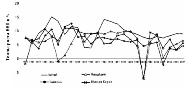 Еще одним полюсом крупного притока прямых иностранных инвестиций в 1970-1990-е гг. стали страны Восточной и Юго-Восточной Азии. Однако в отличие от Латинской Америки азиатский экономический рост был стабильнее и выше (рис. 2).