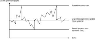 При управлении уровнем ликвидности финансовый менеджер должен исходить из следующей логики: остаток денежных средств хаотически меняется до тех пор, пока не достигает верхнего предела. Как только это происходит, необходимо покупать достаточное количество ликвидных инструментов с целью вернуть уровень денежных средств к некоторому нормальному уровню (точке возврата). Если запас денежных средств достигает нижнего предела, то в этом случае необходимо продавать ликвидные краткосрочные ценные бумаги и таким образом пополнять запас ликвидности до нормального предела (рис. 2).