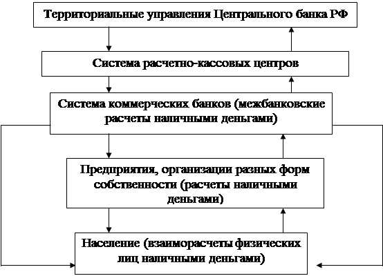 Из приведенной схемы видно, что налично-денежный оборот начинается в расчетно-кассовых центрах Центрального банка РФ. Наличные деньги переводятся из их резервных фондов в оборотные кассы, тем самым они поступают в обращение. Из оборотных касс РКЦ наличные деньги направляются в операционные кассы коммерческих банков.