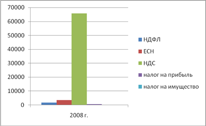 За период 2008 г. было начислено налогов в сумме 71257,86 тыс. руб. Как видно из рис. 2.2.1, 2.2.2, основную долю занимает налог на добавленную стоимость (92,%).